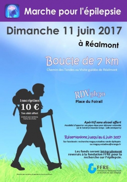 Dimanche 11 juin prochain aura lieu la seconde marche pour l'épilepsie de Réalmont sur une boucle de 7 kilomètres avec au choix le chemin des Tendes ou une visite guidée de Réalmont. Départ du foirail à 9h30, apéritif sans alcool offert au retour, possibilité d'amener son pique-nique pour l'après rando sur le foirail (en cas de mauvais temps, repli prévu à la salle polyvalente). Manifestation organisée par Maguy Estadieu dont le leitmotiv est «Oser en parler est déjà un grand pas», les fonds récoltés seront entièrement reversés à la fondation FFRE pour la recherche sur l'épilepsie.